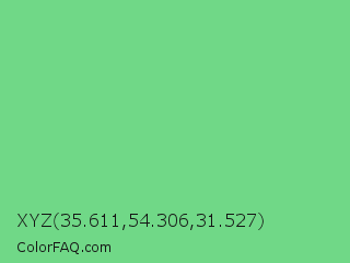 XYZ 35.611,54.306,31.527 Color is a light green color and the nearest color is Pastel Green #77dd77. Hex code #70d887 and RGB value is rgb(112,216,135). In RGB color space, this color is composed of 44% red, 85% green, 53% blue, In CMYK color space, this color is composed of 48% cyan, 0% magenta, 38% yellow , 15% black , In HSL color space, this color has a hue angle of 133° , 57% saturation and 64% lightness.