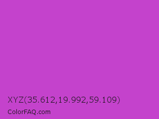 XYZ 35.612,19.992,59.109 Color is a normal magenta color and the nearest color is Steel Pink #cc33cc. Hex code #c442cc and RGB value is rgb(196,66,204). In RGB color space, this color is composed of 77% red, 26% green, 80% blue, In CMYK color space, this color is composed of 4% cyan, 68% magenta, 0% yellow , 20% black , In HSL color space, this color has a hue angle of 297° , 58% saturation and 53% lightness.