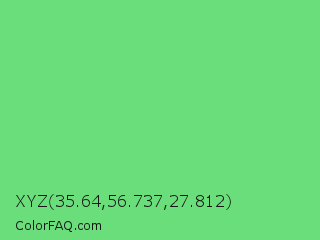 XYZ 35.64,56.737,27.812 Color is a light green color and the nearest color is Pastel Green #77dd77. Hex code #6ade7b and RGB value is rgb(106,222,123). In RGB color space, this color is composed of 42% red, 87% green, 48% blue, In CMYK color space, this color is composed of 52% cyan, 0% magenta, 45% yellow , 13% black , In HSL color space, this color has a hue angle of 129° , 64% saturation and 64% lightness.