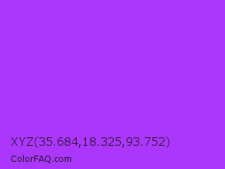 XYZ 35.684,18.325,93.752 Color is a normal purple color and the nearest color is Veronica #a020f0. Hex code #ab36fc and RGB value is rgb(171,54,252). In RGB color space, this color is composed of 67% red, 21% green, 99% blue, In CMYK color space, this color is composed of 32% cyan, 79% magenta, 0% yellow , 1% black , In HSL color space, this color has a hue angle of 275° , 97% saturation and 60% lightness.