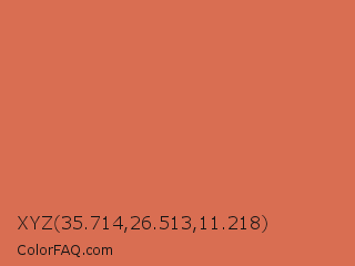XYZ 35.714,26.513,11.218 Color is a normal red color and the nearest color is Terracotta #e2725b. Hex code #d96e52 and RGB value is rgb(217,110,82). In RGB color space, this color is composed of 85% red, 43% green, 32% blue, In CMYK color space, this color is composed of 0% cyan, 49% magenta, 62% yellow , 15% black , In HSL color space, this color has a hue angle of 12° , 64% saturation and 59% lightness.