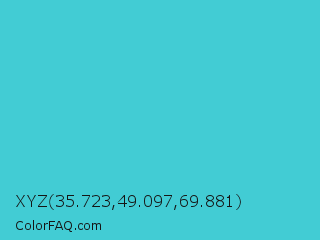 XYZ 35.723,49.097,69.881 Color is a normal cyan color and the nearest color is Medium Turquoise #48d1cc. Hex code #42ccd4 and RGB value is rgb(66,204,212). In RGB color space, this color is composed of 26% red, 80% green, 83% blue, In CMYK color space, this color is composed of 69% cyan, 4% magenta, 0% yellow , 17% black , In HSL color space, this color has a hue angle of 183° , 63% saturation and 55% lightness.