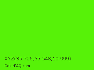 XYZ 35.726,65.548,10.999 Color is a normal green color and the nearest color is Chlorophyll Green #4aff00. Hex code #57f208 and RGB value is rgb(87,242,8). In RGB color space, this color is composed of 34% red, 95% green, 3% blue, In CMYK color space, this color is composed of 64% cyan, 0% magenta, 97% yellow , 5% black , In HSL color space, this color has a hue angle of 100° , 94% saturation and 49% lightness.