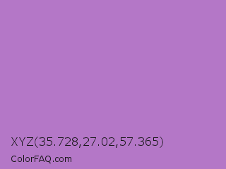 XYZ 35.728,27.02,57.365 Color is a light purple color and the nearest color is African Violet #b284be. Hex code #b477c7 and RGB value is rgb(180,119,199). In RGB color space, this color is composed of 71% red, 47% green, 78% blue, In CMYK color space, this color is composed of 10% cyan, 40% magenta, 0% yellow , 22% black , In HSL color space, this color has a hue angle of 286° , 42% saturation and 62% lightness.