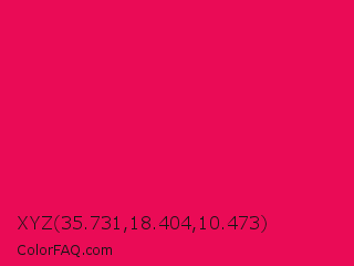 XYZ 35.731,18.404,10.473 Color is a normal rose color and the nearest color is Razzmatazz Crayola #e30b5c. Hex code #ea0b56 and RGB value is rgb(234,11,86). In RGB color space, this color is composed of 92% red, 4% green, 34% blue, In CMYK color space, this color is composed of 0% cyan, 95% magenta, 63% yellow , 8% black , In HSL color space, this color has a hue angle of 340° , 91% saturation and 48% lightness.