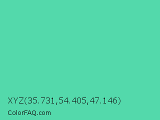 XYZ 35.731,54.405,47.146 Color is a normal green color and the nearest color is Eucalyptus #44d7a8. Hex code #53d9ab and RGB value is rgb(83,217,171). In RGB color space, this color is composed of 33% red, 85% green, 67% blue, In CMYK color space, this color is composed of 62% cyan, 0% magenta, 21% yellow , 15% black , In HSL color space, this color has a hue angle of 159° , 64% saturation and 59% lightness.