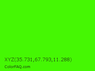 XYZ 35.731,67.793,11.288 Color is a normal green color and the nearest color is Chlorophyll Green #4aff00. Hex code #45f703 and RGB value is rgb(69,247,3). In RGB color space, this color is composed of 27% red, 97% green, 1% blue, In CMYK color space, this color is composed of 72% cyan, 0% magenta, 99% yellow , 3% black , In HSL color space, this color has a hue angle of 104° , 98% saturation and 49% lightness.