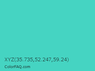 XYZ 35.735,52.247,59.24 Color is a normal cyan color and the nearest color is Medium Turquoise #48d1cc. Hex code #45d4c2 and RGB value is rgb(69,212,194). In RGB color space, this color is composed of 27% red, 83% green, 76% blue, In CMYK color space, this color is composed of 67% cyan, 0% magenta, 8% yellow , 17% black , In HSL color space, this color has a hue angle of 172° , 62% saturation and 55% lightness.