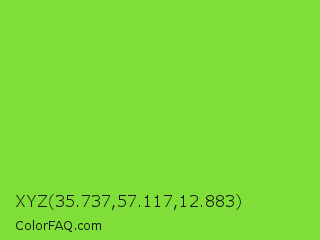 XYZ 35.737,57.117,12.883 Color is a normal green color and the nearest color is Kiwi #8ee53f. Hex code #80de38 and RGB value is rgb(128,222,56). In RGB color space, this color is composed of 50% red, 87% green, 22% blue, In CMYK color space, this color is composed of 42% cyan, 0% magenta, 75% yellow , 13% black , In HSL color space, this color has a hue angle of 94° , 72% saturation and 55% lightness.