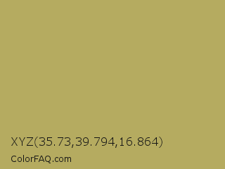 XYZ 35.73,39.794,16.864 Color is a normal yellow color and the nearest color is Olive Green #b5b35c. Hex code #b5ab60 and RGB value is rgb(181,171,96). In RGB color space, this color is composed of 71% red, 67% green, 38% blue, In CMYK color space, this color is composed of 0% cyan, 6% magenta, 47% yellow , 29% black , In HSL color space, this color has a hue angle of 53° , 36% saturation and 54% lightness.
