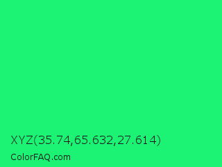 XYZ 35.74,65.632,27.614 Color is a normal green color and the nearest color is Spring Green #00ff7f. Hex code #1cf375 and RGB value is rgb(28,243,117). In RGB color space, this color is composed of 11% red, 95% green, 46% blue, In CMYK color space, this color is composed of 88% cyan, 0% magenta, 52% yellow , 5% black , In HSL color space, this color has a hue angle of 145° , 90% saturation and 53% lightness.
