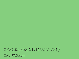 XYZ 35.752,51.119,27.721 Color is a light green color and the nearest color is De York #7ac488. Hex code #85cf7e and RGB value is rgb(133,207,126). In RGB color space, this color is composed of 52% red, 81% green, 49% blue, In CMYK color space, this color is composed of 36% cyan, 0% magenta, 39% yellow , 19% black , In HSL color space, this color has a hue angle of 115° , 46% saturation and 65% lightness.