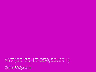 XYZ 35.75,17.359,53.691 Color is a normal magenta color and the nearest color is Deep Magenta #cc00cc. Hex code #cf05c4 and RGB value is rgb(207,5,196). In RGB color space, this color is composed of 81% red, 2% green, 77% blue, In CMYK color space, this color is composed of 0% cyan, 98% magenta, 5% yellow , 19% black , In HSL color space, this color has a hue angle of 303° , 95% saturation and 42% lightness.