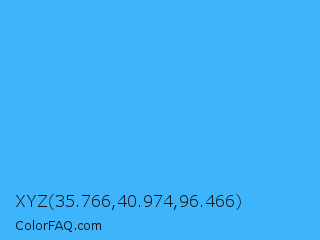 XYZ 35.766,40.974,96.466 Color is a light blue color and the nearest color is Picton Blue #45b1e8. Hex code #3eb5fa and RGB value is rgb(62,181,250). In RGB color space, this color is composed of 24% red, 71% green, 98% blue, In CMYK color space, this color is composed of 75% cyan, 28% magenta, 0% yellow , 2% black , In HSL color space, this color has a hue angle of 202° , 95% saturation and 61% lightness.