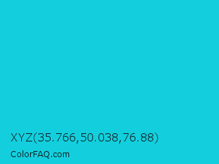 XYZ 35.766,50.038,76.88 Color is a normal cyan color and the nearest color is Dark Turquoise #00ced1. Hex code #13cfde and RGB value is rgb(19,207,222). In RGB color space, this color is composed of 7% red, 81% green, 87% blue, In CMYK color space, this color is composed of 91% cyan, 7% magenta, 0% yellow , 13% black , In HSL color space, this color has a hue angle of 184° , 84% saturation and 47% lightness.