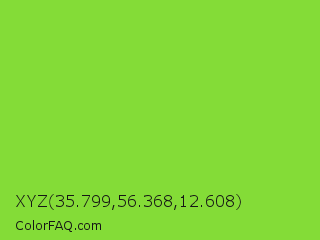 XYZ 35.799,56.368,12.608 Color is a normal green color and the nearest color is Kiwi #8ee53f. Hex code #84dc37 and RGB value is rgb(132,220,55). In RGB color space, this color is composed of 52% red, 86% green, 22% blue, In CMYK color space, this color is composed of 40% cyan, 0% magenta, 75% yellow , 14% black , In HSL color space, this color has a hue angle of 92° , 70% saturation and 54% lightness.