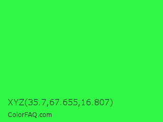 XYZ 35.7,67.655,16.807 Color is a normal green color and the nearest color is Lime Green #32cd32. Hex code #33f745 and RGB value is rgb(51,247,69). In RGB color space, this color is composed of 20% red, 97% green, 27% blue, In CMYK color space, this color is composed of 79% cyan, 0% magenta, 72% yellow , 3% black , In HSL color space, this color has a hue angle of 126° , 92% saturation and 58% lightness.