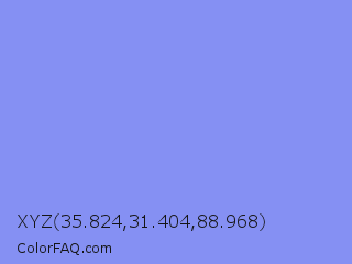 XYZ 35.824,31.404,88.968 Color is a light blue color and the nearest color is Portage #8b9fee. Hex code #8590f3 and RGB value is rgb(133,144,243). In RGB color space, this color is composed of 52% red, 56% green, 95% blue, In CMYK color space, this color is composed of 45% cyan, 41% magenta, 0% yellow , 5% black , In HSL color space, this color has a hue angle of 234° , 82% saturation and 74% lightness.