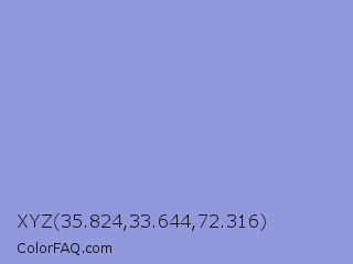 XYZ 35.824,33.644,72.316 Color is a light blue color and the nearest color is Ceil #92a1cf. Hex code #9198dc and RGB value is rgb(145,152,220). In RGB color space, this color is composed of 57% red, 60% green, 86% blue, In CMYK color space, this color is composed of 34% cyan, 31% magenta, 0% yellow , 14% black , In HSL color space, this color has a hue angle of 234° , 52% saturation and 72% lightness.