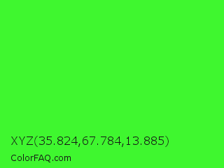 XYZ 35.824,67.784,13.885 Color is a normal green color and the nearest color is Neon Green #39ff14. Hex code #3ff72f and RGB value is rgb(63,247,47). In RGB color space, this color is composed of 25% red, 97% green, 18% blue, In CMYK color space, this color is composed of 74% cyan, 0% magenta, 81% yellow , 3% black , In HSL color space, this color has a hue angle of 115° , 93% saturation and 58% lightness.