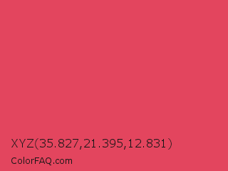 XYZ 35.827,21.395,12.831 Color is a normal red color and the nearest color is Paradise Pink #e63e62. Hex code #e3455e and RGB value is rgb(227,69,94). In RGB color space, this color is composed of 89% red, 27% green, 37% blue, In CMYK color space, this color is composed of 0% cyan, 70% magenta, 59% yellow , 11% black , In HSL color space, this color has a hue angle of 351° , 74% saturation and 58% lightness.