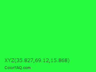 XYZ 35.827,69.12,15.868 Color is a normal green color and the nearest color is Neon Green #39ff14. Hex code #26fa3d and RGB value is rgb(38,250,61). In RGB color space, this color is composed of 15% red, 98% green, 24% blue, In CMYK color space, this color is composed of 85% cyan, 0% magenta, 76% yellow , 2% black , In HSL color space, this color has a hue angle of 127° , 95% saturation and 56% lightness.