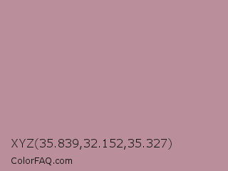 XYZ 35.839,32.152,35.327 Color is a light rose color and the nearest color is Rosy Brown #bc8f8f. Hex code #ba8e9b and RGB value is rgb(186,142,155). In RGB color space, this color is composed of 73% red, 56% green, 61% blue, In CMYK color space, this color is composed of 0% cyan, 24% magenta, 17% yellow , 27% black , In HSL color space, this color has a hue angle of 342° , 24% saturation and 64% lightness.