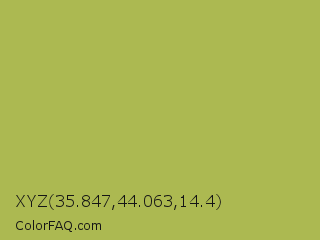 XYZ 35.847,44.063,14.4 Color is a normal yellow color and the nearest color is Olive Green #b5b35c. Hex code #acb951 and RGB value is rgb(172,185,81). In RGB color space, this color is composed of 67% red, 73% green, 32% blue, In CMYK color space, this color is composed of 7% cyan, 0% magenta, 56% yellow , 27% black , In HSL color space, this color has a hue angle of 68° , 43% saturation and 52% lightness.