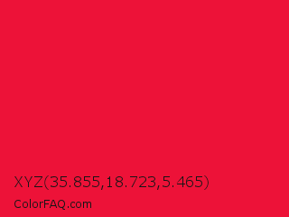XYZ 35.855,18.723,5.465 Color is a normal red color and the nearest color is Red Ribbon #ed0a3f. Hex code #ed1238 and RGB value is rgb(237,18,56). In RGB color space, this color is composed of 93% red, 7% green, 22% blue, In CMYK color space, this color is composed of 0% cyan, 92% magenta, 76% yellow , 7% black , In HSL color space, this color has a hue angle of 350° , 86% saturation and 50% lightness.