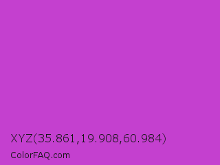 XYZ 35.861,19.908,60.984 Color is a normal magenta color and the nearest color is Steel Pink #cc33cc. Hex code #c440cf and RGB value is rgb(196,64,207). In RGB color space, this color is composed of 77% red, 25% green, 81% blue, In CMYK color space, this color is composed of 5% cyan, 69% magenta, 0% yellow , 19% black , In HSL color space, this color has a hue angle of 295° , 60% saturation and 53% lightness.