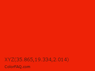 XYZ 35.865,19.334,2.014 Color is a normal red color and the nearest color is Scarlet #ff2400. Hex code #ee2206 and RGB value is rgb(238,34,6). In RGB color space, this color is composed of 93% red, 13% green, 2% blue, In CMYK color space, this color is composed of 0% cyan, 86% magenta, 97% yellow , 7% black , In HSL color space, this color has a hue angle of 7° , 95% saturation and 48% lightness.