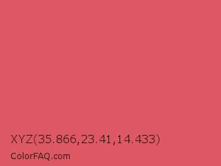 XYZ 35.866,23.41,14.433 Color is a light red color and the nearest color is Mandy #e25465. Hex code #de5863 and RGB value is rgb(222,88,99). In RGB color space, this color is composed of 87% red, 35% green, 39% blue, In CMYK color space, this color is composed of 0% cyan, 60% magenta, 55% yellow , 13% black , In HSL color space, this color has a hue angle of 355° , 67% saturation and 61% lightness.