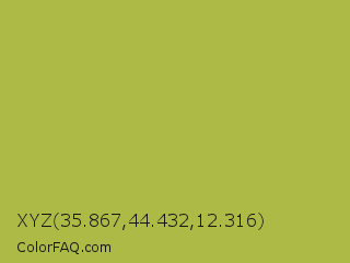XYZ 35.867,44.432,12.316 Color is a normal yellow color and the nearest color is Android Green #a4c639. Hex code #adba45 and RGB value is rgb(173,186,69). In RGB color space, this color is composed of 68% red, 73% green, 27% blue, In CMYK color space, this color is composed of 7% cyan, 0% magenta, 63% yellow , 27% black , In HSL color space, this color has a hue angle of 67° , 46% saturation and 50% lightness.