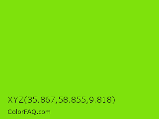 XYZ 35.867,58.855,9.818 Color is a normal green color and the nearest color is Alien Armpit #84de02. Hex code #7ee20c and RGB value is rgb(126,226,12). In RGB color space, this color is composed of 49% red, 89% green, 5% blue, In CMYK color space, this color is composed of 44% cyan, 0% magenta, 95% yellow , 11% black , In HSL color space, this color has a hue angle of 88° , 90% saturation and 47% lightness.