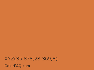 XYZ 35.878,28.369,8 Color is a normal orange color and the nearest color is Raw Sienna Crayola #d27d46. Hex code #d8783d and RGB value is rgb(216,120,61). In RGB color space, this color is composed of 85% red, 47% green, 24% blue, In CMYK color space, this color is composed of 0% cyan, 44% magenta, 72% yellow , 15% black , In HSL color space, this color has a hue angle of 23° , 67% saturation and 54% lightness.