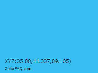 XYZ 35.88,44.337,89.105 Color is a normal blue color and the nearest color is Picton Blue #45b1e8. Hex code #36bff0 and RGB value is rgb(54,191,240). In RGB color space, this color is composed of 21% red, 75% green, 94% blue, In CMYK color space, this color is composed of 78% cyan, 20% magenta, 0% yellow , 6% black , In HSL color space, this color has a hue angle of 196° , 86% saturation and 58% lightness.