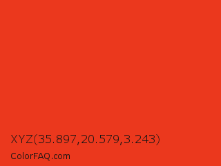 XYZ 35.897,20.579,3.243 Color is a normal red color and the nearest color is Vermilion #d9381e. Hex code #eb381d and RGB value is rgb(235,56,29). In RGB color space, this color is composed of 92% red, 22% green, 11% blue, In CMYK color space, this color is composed of 0% cyan, 76% magenta, 88% yellow , 8% black , In HSL color space, this color has a hue angle of 8° , 84% saturation and 52% lightness.
