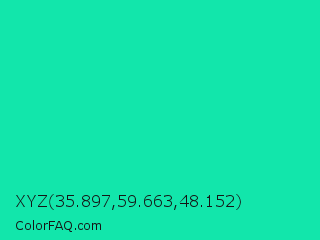 XYZ 35.897,59.663,48.152 Color is a normal green color and the nearest color is Medium Spring Green #00fa9a. Hex code #12e6ab and RGB value is rgb(18,230,171). In RGB color space, this color is composed of 7% red, 90% green, 67% blue, In CMYK color space, this color is composed of 92% cyan, 0% magenta, 26% yellow , 10% black , In HSL color space, this color has a hue angle of 163° , 85% saturation and 49% lightness.
