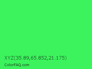 XYZ 35.89,65.852,21.175 Color is a normal green color and the nearest color is UFO Green #3cd070. Hex code #3cf35d and RGB value is rgb(60,243,93). In RGB color space, this color is composed of 24% red, 95% green, 36% blue, In CMYK color space, this color is composed of 75% cyan, 0% magenta, 62% yellow , 5% black , In HSL color space, this color has a hue angle of 131° , 88% saturation and 59% lightness.