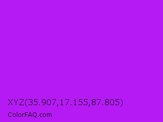 XYZ 35.907,17.155,87.805 Color is a normal purple color and the nearest color is Veronica #a020f0. Hex code #b51af5 and RGB value is rgb(181,26,245). In RGB color space, this color is composed of 71% red, 10% green, 96% blue, In CMYK color space, this color is composed of 26% cyan, 89% magenta, 0% yellow , 4% black , In HSL color space, this color has a hue angle of 282° , 92% saturation and 53% lightness.