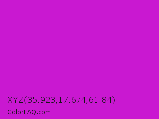 XYZ 35.923,17.674,61.84 Color is a normal magenta color and the nearest color is Deep Magenta #cc00cc. Hex code #c918d1 and RGB value is rgb(201,24,209). In RGB color space, this color is composed of 79% red, 9% green, 82% blue, In CMYK color space, this color is composed of 4% cyan, 89% magenta, 0% yellow , 18% black , In HSL color space, this color has a hue angle of 297° , 79% saturation and 46% lightness.