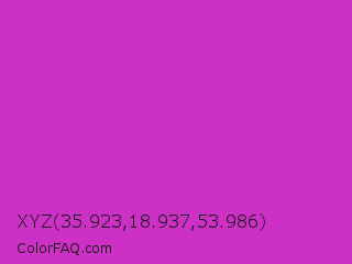 XYZ 35.923,18.937,53.986 Color is a normal magenta color and the nearest color is Steel Pink #cc33cc. Hex code #cc30c4 and RGB value is rgb(204,48,196). In RGB color space, this color is composed of 80% red, 19% green, 77% blue, In CMYK color space, this color is composed of 0% cyan, 76% magenta, 4% yellow , 20% black , In HSL color space, this color has a hue angle of 303° , 62% saturation and 49% lightness.