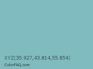 XYZ 35.927,43.814,55.854 Color is a light cyan color and the nearest color is Neptune #7cb7bb. Hex code #7fbbbf and RGB value is rgb(127,187,191). In RGB color space, this color is composed of 50% red, 73% green, 75% blue, In CMYK color space, this color is composed of 34% cyan, 2% magenta, 0% yellow , 25% black , In HSL color space, this color has a hue angle of 184° , 33% saturation and 62% lightness.