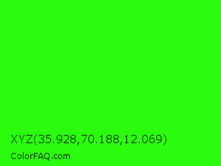 XYZ 35.928,70.188,12.069 Color is a normal green color and the nearest color is Neon Green #39ff14. Hex code #2cfc0e and RGB value is rgb(44,252,14). In RGB color space, this color is composed of 17% red, 99% green, 5% blue, In CMYK color space, this color is composed of 83% cyan, 0% magenta, 94% yellow , 1% black , In HSL color space, this color has a hue angle of 112° , 98% saturation and 52% lightness.