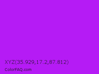 XYZ 35.929,17.2,87.812 Color is a normal purple color and the nearest color is Veronica #a020f0. Hex code #b51bf5 and RGB value is rgb(181,27,245). In RGB color space, this color is composed of 71% red, 11% green, 96% blue, In CMYK color space, this color is composed of 26% cyan, 89% magenta, 0% yellow , 4% black , In HSL color space, this color has a hue angle of 282° , 92% saturation and 53% lightness.
