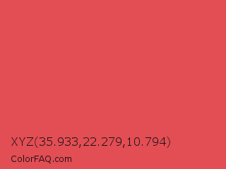 XYZ 35.933,22.279,10.794 Color is a normal red color and the nearest color is Desire #ea3c53. Hex code #e34d54 and RGB value is rgb(227,77,84). In RGB color space, this color is composed of 89% red, 30% green, 33% blue, In CMYK color space, this color is composed of 0% cyan, 66% magenta, 63% yellow , 11% black , In HSL color space, this color has a hue angle of 357° , 73% saturation and 60% lightness.