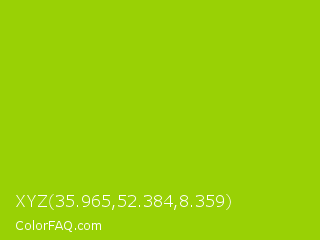 XYZ 35.965,52.384,8.359 Color is a normal lime color and the nearest color is Sheen Green #8fd400. Hex code #99d105 and RGB value is rgb(153,209,5). In RGB color space, this color is composed of 60% red, 82% green, 2% blue, In CMYK color space, this color is composed of 27% cyan, 0% magenta, 98% yellow , 18% black , In HSL color space, this color has a hue angle of 76° , 95% saturation and 42% lightness.