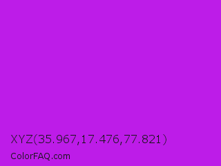 XYZ 35.967,17.476,77.821 Color is a normal purple color and the nearest color is Vivid Mulberry #b80ce3. Hex code #bd1ce8 and RGB value is rgb(189,28,232). In RGB color space, this color is composed of 74% red, 11% green, 91% blue, In CMYK color space, this color is composed of 19% cyan, 88% magenta, 0% yellow , 9% black , In HSL color space, this color has a hue angle of 287° , 82% saturation and 51% lightness.