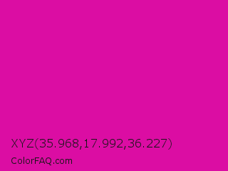 XYZ 35.968,17.992,36.227 Color is a normal magenta color and the nearest color is Hollywood Cerise #f400a1. Hex code #db0da3 and RGB value is rgb(219,13,163). In RGB color space, this color is composed of 86% red, 5% green, 64% blue, In CMYK color space, this color is composed of 0% cyan, 94% magenta, 26% yellow , 14% black , In HSL color space, this color has a hue angle of 316° , 89% saturation and 45% lightness.