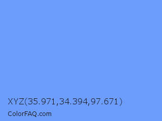 XYZ 35.971,34.394,97.671 Color is a light blue color and the nearest color is Cornflower Blue #6495ed. Hex code #6c9dfd and RGB value is rgb(108,157,253). In RGB color space, this color is composed of 42% red, 62% green, 99% blue, In CMYK color space, this color is composed of 57% cyan, 38% magenta, 0% yellow , 1% black , In HSL color space, this color has a hue angle of 220° , 97% saturation and 71% lightness.